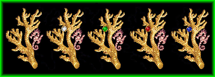 | Large Coral-Branch Brooch-Pins with Pink-Gold Seahorses with Curled-Back Tails Plain or with precious stones. Height 1-1/4" Design © Whitfield Jack, Key West, FL |