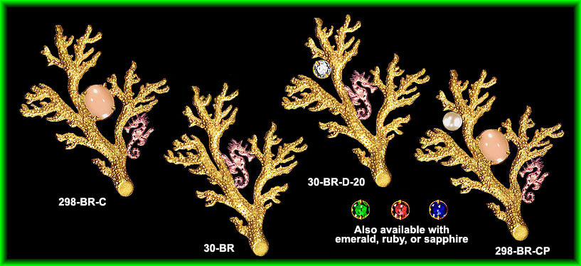 | Extra-Large Coral Branch Brooch with pink-gold seahorses. 1-3/4" high. | . | |