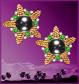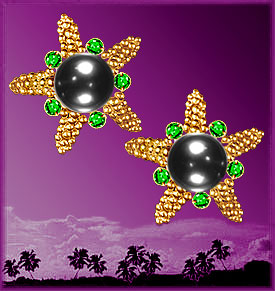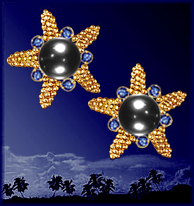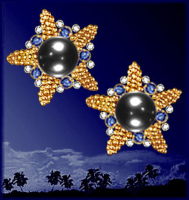 | 366. | 30-Stone Starfish Extravaganza Earrings with 12mm natural color black South Seas Pearls and precious stones. Post and clip combination. 18K gold. Note:There may be some price variation due to price of different pearls. Also available with 12 mm cultured White South Seas Pearls. | . |