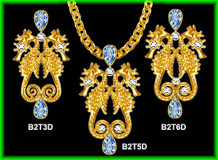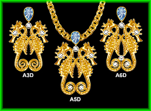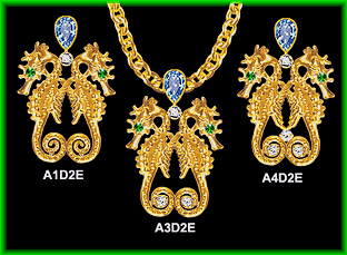 | Double Seahorse Pendant with two pear-shaped blue Topaz (4x6mm ), plus the stones specified below. Other combinations available. Please inquire. | 14K | 18K | |