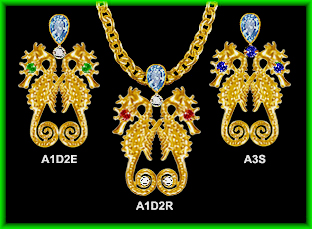 | Double Seahorse Pendant with one pear-shaped blue Topaz (4x6mm), plus the stones specified below. Other combinations available. Please inquire. | 14K | 18K | |