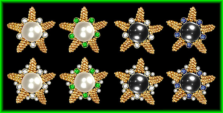 | 271P. | Starfish pendant with diamonds and natural color Tahitian Black Pearl of white South Seas Pearl. Pearl size approximately 12 mm round. Total diamond weight 40 points. SI1 GHI. 18K gold. Price dependent on pearl availability. Please inquire. Aailable with five diamonds, emeralds, rubies, or sapphires. Also with 10-diamond accents. | 2573 to 6051 |