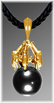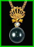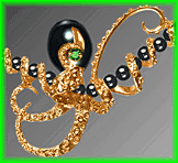 | click 12 mm x 14 mm Black Tahitian Pearl. Emer- ald eye. 18K gold. Federal Copyright # VA 956-757 |