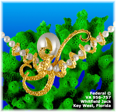 | 272. | Octopus with White South Seas Pearl head. Also available with natural color Tahitian Pearls in black, grey, or saffron yellow. Octopus eye available as emerald, diamond, ruby, or sapphire. Pearl size is approximately 13 mm x 14 mm pear shaped. 18K gold. Price dependent on availability. Please inquire. The Octopus may be equipped with an 18K brooch pin for 108.00 extra so that it may be worn as a pin or pendant. | 2560 to 5921 |