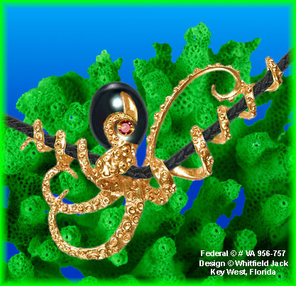 Design © Whitfield Jack Octopus is available with a choice of a natural-color Black Tahitian Pearl or a white, cream, saffron, or grey South Seas Pearl. Prices vary according to quality, color, and availability. Also available with gold head instead of a pearl. May be worn on a strand of pearls, a black rope, or a chain. |