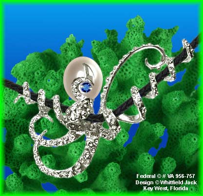 Design © Whitfield Jack Octopus is available with a choice of a natural-color Black Tahitian Pearl or a white, cream, saffron, or grey South Seas Pearl. Prices vary according to quality, color, and availability. Also available with gold head instead of a pearl. May be worn on a strand of pearls, a black rope, or a chain. |