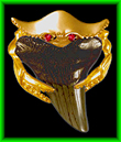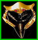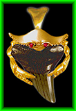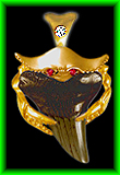 Crab Holding Shark Tooth Crab Shark Tooth Holder Federal Copyright #VA925-949 Design © Whitfield Jack, Key West, FL 14K gold crabs with ruby, emerald, sapphire, or diamond eyes. Dark teeth are fossilized prehistoric. All designs have chain loops concealed behind the piece. Chain exits at top left and right corners. A top-mounted heavyweight bail for large chains is available at extra cost. |