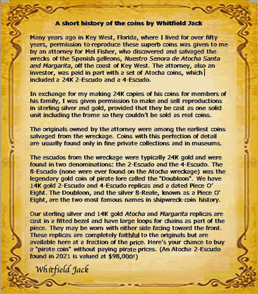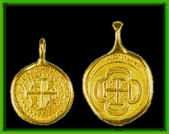 | . | 14K Gold 2-escudo replicas. Approx: 1/2" |