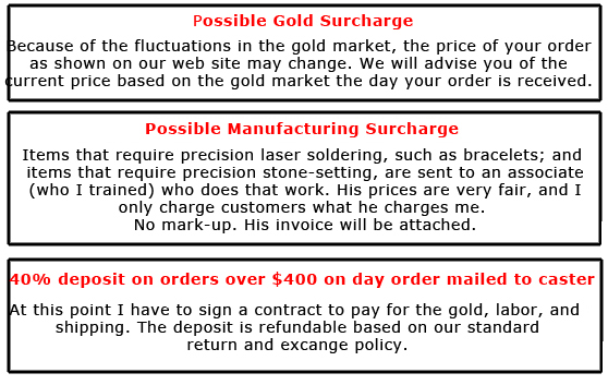 In order not to end up with unneeded pieces of jewelry, which have to be disassembled, melted, re-cast and refinished for another order, we reserve the right to charge a fee of 20% of the price of the returned or exchanged item or items. Otherwise, we are operating at a loss.