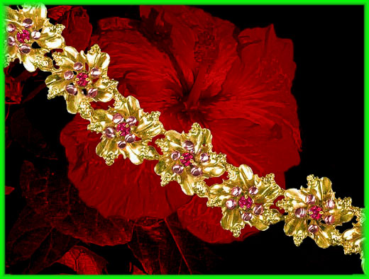 | 162. | Multicolored Conch Hibiscus bracelet with stones. 14K yellow gold. 22K yellow gold. 14K green gold, 14K rose gold, 14K white gold. Rubies, diamonds, emeralds, sapphires. Bracelet has a hidden clasp with a safety catch. |