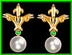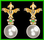click Dolphin Fleur-de-lis. 18K gold with 8 mm Japanese Cultured Pearls. Two emeralds. |