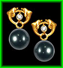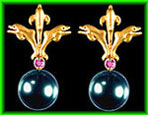 | click Dolphin Fleur-de-lis. 14K gold with 10 mm natural black Tahitian Pearls and two rubies. |