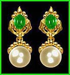 | click 22K gold dolphin ear drops. Cabochon emeralds. 4.04 carats total. 12 mm South Sea Pearls. |