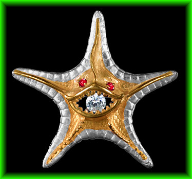 A Fantasy Starfish by Whitfield Jack 1-5/8" high. Pin/pendant combination. Sterling silver, 24K gold vermeil, cubic zirconium in mouth, natural ruby eyes |