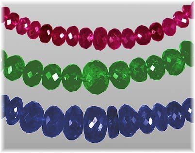 Necklaces with faceted precious stones: rubies, emeralds, sapphires.