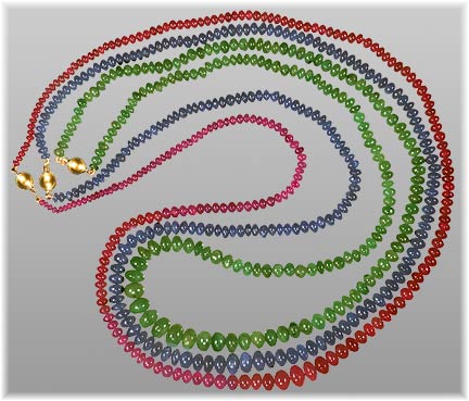unfaceted gem. These ruby, emerald, and sapphire beads vary in