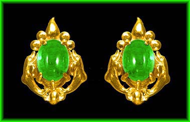A pair of 22K gold dolphin eardrops set with gem quality emerald cabachons